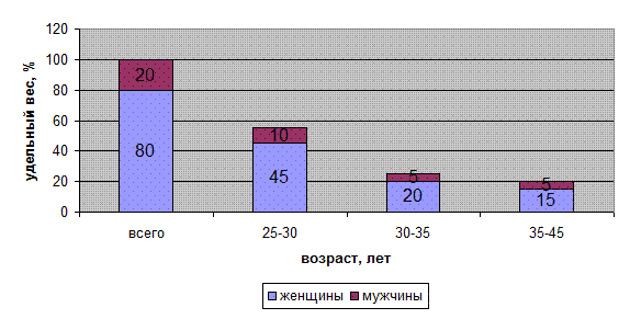 К оперативным работникам на предприятии относится торговый персонал – это продавцы и кассиры, административно-управленческий персонал – это директор, главный бухгалтер, заведующая секциями, специалисты – товароведы. Как видно из рис. 2.1 руководство предприятием осуществляет директор магазина, который одновременно является основным его учредителем. Директор без доверенности от имени предприятия имеет право представлять его интересы, заключать договоры, выдавать доверенности, утверждать штатное расписание, издавать приказы и указания. Директору подчиняются товароведы, главный бухгалтер и заведующая секциями, которым в свою очередь, подчиняются, торговый и обслуживающий персонал. Финансовое состояние предприятия зависит не только от внешних факторов, таких как его местонахождения, отдаленность от поставщиков и потребителей, экономическая и политическая ситуация в стране и т. п., а также зависит и от работников, которые являются «лицом магазина» и от них зависит успех деятельности предприятия. Следовательно, имеет смысл проанализировать состав и структуру кадрового персонала на ООО «Камелия», для этого рассмотрим табл. 2.1. По состоянию на 1.12.99 г. среднесписочная численность работников магазина составила 20 человек, из которых 8 человек относятся к административно-управленческому персоналу. Далее рассмотрим укомплектованность магазина кадрами с высшим и средним специальным образованием и определим их удельный вес в общей численности персонала (табл. 2.2). Из диаграммы на рисунке 2.3 видно, что в структуре персонала 80% приходится на женщин, 20% - мужчины, причем среди женщин – 45% в возрасте от 25 до 30 лет, 20% - 30 – 35 лет и 15% - 35 – 45 лет. Таблица 2.1 Кадровый состав ООО «Камелия»
