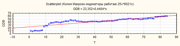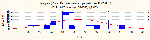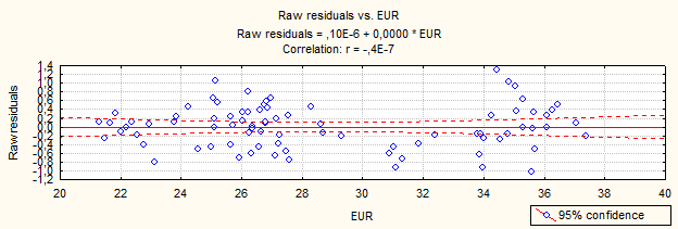 Приложения Таблица 1 Трендовая модель развития показателя EUR во времени Regression Summary for Dependent Variable: EUR R= 0,88372034 R2 = 0,78096163 Adjusted R2 = 0,77783251 F(1,70)=249,58 p<0,0000 Std.Error of estimate: 2,0228