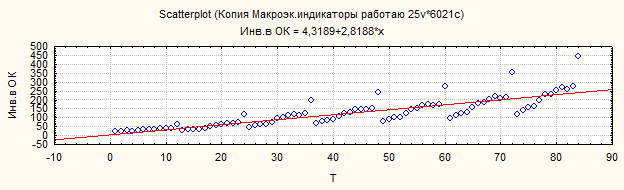 где FP – вектор финансовых показателей фирмы, М – вектор макроэкономических индикаторов, MFI – вектор мировых фондовых индексов, V – вектор мировых валют котируемых ЦБ, α, β, γ , µ – векторы числовых коэффициен-тов, ε – вектор ошибки. 2. Анализ влияния каждой из групп на цену исследуемого актива. Для этого осуществляется построение многофакторных моделей, в качестве факторных подмножеств которых используются показатели выделенных групп. 3. Выбор переменных, которые войдут в конечную модель, на основе критерия значимости. Критерий значимости для переменных определим, как: вероятность принятия переменной значения ноль должна быть меньше 10%. 4. Построение многофакторной модели с использованием сформированных групп. Для удобства практического применения модели возможно произвести упрощение построенной модели, уменьшив количество входящих переменных, используя только значимые переменные[15] . 2. Практическая реализация модели АРТ Проведем численную реализацию модели АРТ при использовании построенного алгоритма. Группы влияющих факторов В исследовании определены следующие группы влияющих факторов: макроэкономические индикаторы страны и валюта (котировки ЦБ иностранной валюты). Следует подчеркнуть, что явного, логически-обоснованного влияния выбранных факторов на стоимость ценных бумаг нет. Попробуем определить возможную статистическую зависимость. Исходные данные Для исследования были выбрана ценная бумага, занятая в энергетической отрасли. Этот выбор обоснован предстоящими кардинальными изменениями в этой отрасли, а значит, изменениями инвестиционных стратегий, что повлечет за собой изменения стоимости финансовых активов. В 2004 г. правительство приняло решение реформирования энергетического сектора России. До 2007 г. намечено переформировать структуру сектора: создать Транспортные генерирующие компании (ТГК) и оптовые генерирующие компании (ОГК), которые будут разделены по территориальному критерию, что позволит инвесторам участвовать в капитале не всего энергетического сектора (компании РАО ЕЭС), а именно в том, который будет им наиболее выгоден. Это несет за собой пересмотр инвестиционных стратегий отраслевых энергетических компаний. Итак, для анализа выбрана следующая компания: ОАО "Иркутскэнерго"; код СКРИН - IGRZ; отрасль - Региональные энергетические компании. Временной интервал Временной период: 01. 02. 1998 г.– 31. 12. 2004 г., чтобы проанализировать долгосрочное влияние выбранных факторов, а также отразить влияние дефолта 1998 г. на цену акций. Составляющие показатели Вектор макроэкономические индикаторы состоит из следующих 7 показателей: Динамика ВВП[16] , Инвестиции в основной капитал[17] , Объем промышленной продукции[18] , Внешнеторговый оборот (Экспорт товаров и Импорт товаров)[19] , Индекс потребительских цен[20] , Реальные располагаемые денежные доходы[21] , Общая численность безработных[22] . Вектор валюта состоит из следующих 3 показателей: Английский фунт стерлингов, Доллар США, ЕВРО. Численная реализация Для проведения анализа необходимы данные, охватывающие временной интервал с 01. 02. 1998 г. по 31. 12. 2004 г. и образующие выборки объемом n = 83 . Для получения данных о курсе ЕВРО на 1998 г. построим трендовую модель развития данного показателя во времени (табл. 1) и проведем процедуру интерполяции (табл. 2). Исходные данные для модел