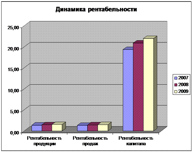 Предварительная оценка результатов деятельности предприятия указывает на следующие результаты. Выручка от реализации за истекший период значительно возрос (рост за 2007-2009 года составил 29,84%), что указывает на рост товарооборота предприятия, что не может негативно сказаться на общем благосостоянии организации. Заметим также, что себестоимость продукции возросла в меньшей степени, чем выручка (за период 29,54%). Такая тенденция должна привести к росту прибыли от реализации и увеличении роста прибыльности, рентабельности предприятия. Однако данный факт не в полной мере отражает общие финансовые результаты работы предприятия. хотя и прибыль предприятия возросла в гораздо более существенной мере, чем выручка и себестоимость (45,94%). В полной мере отражают результаты работы ОАО «ТДН» показатели рентабельности: рентабельность продаж, продукции, капитала. Динамика данных показателей визуально представлена на диаграмме 2.6