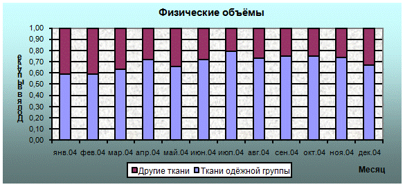 Так, объем товарной продукции по основной деятельности предприятия (переработка сырья в суровые и готовые ткани и обработка давальческого суровья) за 2005 г. вырос до 513,1 млн. руб. (без НДС), т.е. на 88,0 млн. руб. по сравнению с 2004 г. или на 20,70%. Товарная продукция за 2005 г. в сопоставимых ценах (в ценах 2004г.) выросла на 13,61%, т.е. изменение учетных цен дало прирост объема товарного выпуска на 13,61%. Снижение натуральных показателей выпуска за 2005 г. по сравнению с 2004 г. составило по готовым тканям 6,84% (30 639 т.п.м. в 2005 г. и 32 888 т.п.м. в 2004 г. соответственно). Таким образом, большая часть роста товарной продукции за 2005 г. по сравнению с 2004 г. была обеспечена ростом учётных цен на выпускаемую продукцию (17,03 процентных пунктов против 10,50 за счёт структурных сдвигов, если условиться, что нивелирование 6,84% снижения выпуска в натуральных показателях поровну ложится и на структурные сдвиги и на рост учётных цен – вклады данных факторов составили 62 и 38% соответственно).