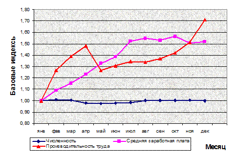 Производительность труда в тыс.руб. на человека выросла с 9,76 в январе до 16,71 (+6,95) в декабре или на 71% . Производительность труда за 2005 г.