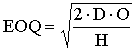 где EOQ (ECONOMIC ORDER QUANTITY) – экономически разумный размер заказа; D – кол-во товара, реализованного за год, штук; O – издержки выполнения заказа, руб.; H – годовые издержки на хранение единицы заказываемого продукта, руб./шт. Например, фирма сбывает равномерно в течение года (N = 12 месяцев) в общей сложности в = 2400 штук изделий. Издержки хранения составляют H = 1,50 руб./шт. в единицу времени (за месяц), издержки заказа составляют O = 150 руб./заказ, тогда оптимальный объем пополнения запасов (величина заказа) равен: