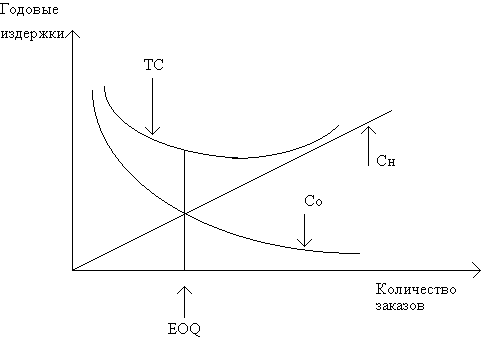 ТС = Сн + Со, где ТС – суммарные годовые издержки; Сн – издержки по хранению запаса на складе; Со – издержки по оформлению заказа; ТС = (Q/2)*H + (D/Q)*O В издержки по хранению запаса на складе (Сн) входят: 1. Постоянная составляющая издержек по хранению, не зависящая от объема хранимого запаса: · затраты на содержание помещений; · амортизация складского оборудования; · страхование складского хозяйства; · оплата определенной части налогов на имущество; · освещение и отопление; · текущий ремонт; · затраты на управленческий персонал; 2. Переменная составляющая издержек на хранение, прямо пропорциональная объему хранимого запаса: · потери от омертвления средств, вложенных в покупку складских запасов; · издержки по страхованию запасов; · потери от порчи хранимых запасов; · прямые затраты на производственный персонал. В издержки по оформлению заказа (Со) входят: 1. Постоянная их составляющая: · расходы по организации заказа; · транспортные расходы, не связанные с объемом партии поставки; 2. Переменная составляющая по оформлению заказа: · транспортные расходы, зависящие от величины партии поставки; расходы по погрузке-разгрузке. Кривая общих годовых издержек является достаточно пологой вблизи точки минимума. Это свидетельствует, что вблизи точки минимума размер запаса может колебаться в некоторых пределах без существенного изменения общих издержек (рис.1.2). При расчете оптимальной партии материальных ресурсов и товаров устанавливают размер, но не момент времени заказа поставки. Момент заказа будет зависеть от способа определения «точки заказа». Точка заказа – минимальный уровень запаса, снижение до которого обусловлено заказом на поставку очередной партии материальных ресурсов, так, чтобы эта партия поступила до полного исчерпания запаса на складе. В общем случае на точку заказа влияют следующие факторы: - дневная потребность в ресурсах, - длительность поставки - колебания потребности в ресурсах и времени выполнения заказа, - степень риска полного исчерпания запаса. В реальной ситуации допускается, что изменения потребности и времени поставки заказа подчиняются закону нормального распределения. В простейшем случае потребность или время выполнения заказа (или обе эти характеристики) могут считаться неизменными. При этом размер запаса, при котором следует заказать новую партию Q (точка заказа), может быть определен как Qз=dз*Tз, где в – расход (потребность в ресурсах) в единицу времени, Т – время поставки. Система с фиксированным интервалом времени между заказами предполагает размещение заказов на восполнение запасов с заданной периодичностью. Определить интервал времени между заказами можно с учетом оптимального размера заказа (EOQ). Для расчета интервала времени между заказами (время потребления заказа) используют формулу:
