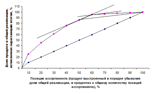 Рисунок 3.1. Кривая АВС – анализа Из рисунка 3.2 видно, что в группу А попадают товары доля продукта общей реализации, исчисленной нарастающим итогом, которых меньше 50%, а в группу В – равные 95,4%, в группу С – в промежутке от 95,4% до 100%. Таким образом, можно вычислить среднестатистическое процентное соотношение групп А, В и С (таблица 3.4). Таблица 3.4 Среднестатистическое процентное соотношение групп А, В и С