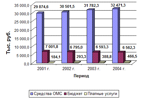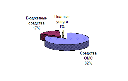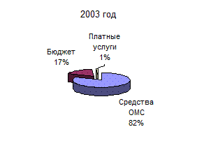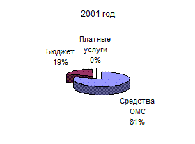 Что касается доли каждого источника в общем объеме доходов в период с 2001- 2004 гг., можно отметить снижение доли бюджетных средств с 19% в 2001 году до 17% в 2004 году, роста средств ОМС с 81% в 2001 году до 82% в 2004 году. Сумма средств от оказания платных услуг также имеет тенденцию к росту на 1% по отношению к 2001 году (рис. 4). Рис. 4. Соотношение источников доходов