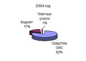 Таким образом основным источником дохода Краснозерской ЦРБ в 2004 году по прежнему являются средства обязательного медицинского страхования (рис. 2), которые составляют 82 % от общего объема планируемых средств. Рис. 2. Структура финансовых средств в 2004 году