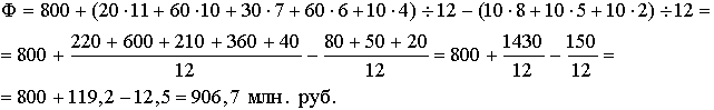где Фн – стоимость основных фондов на начало года; Фв – стоимость основных фондов, введенных в течение года; Фл – стоимость основных фондов, выбывших в течение года; Тв – время (мес) функционирования основных фондов, введенных в течение года; Тл – время (мес), прошедшее после выбытия основных фондов в течение года. В нашем примере введено основных фондов (млн руб.): в январе – 20, феврале – 60, мае – 30, июне – 60, августе – 10, декабре – 50. Выбыло: в апреле – 10, июле – 10, октябре – 10.