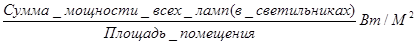 Норма освещенности при лампах накаливания в классных комнатах равна 49 Вт/кв.м., а при люминесцентных 20 Вт/кв.м. Заключение о состоянии кабинета _________________________________________ Пример: 1) Определяем суммарную мощность включенных ламп: 10 х 300 ВТ = 3000 ВТ 2) Определяем удельную мощность ламп: 3000 ВТ : 52 кв.м.=57,7 ВТ/кв.м. 3) Определяем уровень освещенности, коэффициент «е» берем из таблицы № 57,7 ВТ/кв.м. х 3,2 = 184,6 Лк Заключение: Уровень освещенности соответствует гигиеническим нормативам (в учебных кабинетах и лабораториях уровень искусственной освещенности должен быть 150 Лк при использовании ламп накаливания и 300 Лк при люминесцентных лампах). Таблица 5 Таблица для перевода удельной мощности, приходящейся на 1 ВТ/кв.м. в Люксах.