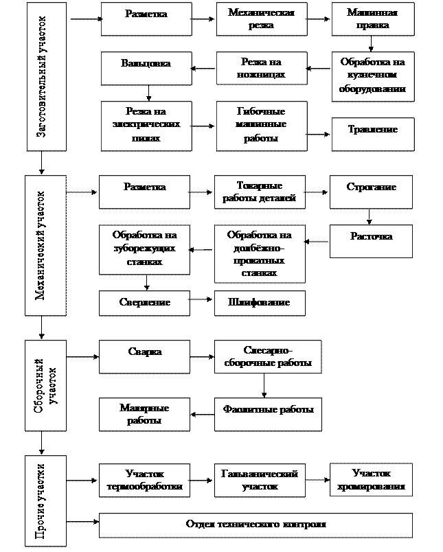 Рисунок 3.1 – Технологическая схема производства 3.1 Технические требования к поверхности основного металла · Детали, поступающие на участок гальванопокрытий после механической обработки, должны быть чистыми, без видимого слоя смазки или эмульсии, металлической стружки, заусенцев, пыли и продуктов коррозии. · Поверхность шлифованных деталей должна быть без забоин, вмятин, прижогов, рисок, заусенцев, дефектов от рихтовочного инструмента. · Острые углы и кромки деталей должны быть скруглены или иметь фаски. Исключение составляет детали из материала толщиной до 1мм. · Шероховатость поверхности деталей, предназначенных для хромирования, должна соответствовать требованиям чертежа или технологии, разработанной согласно чертежу – под защитно-декоративное покрытие – Ra 2,5, под твердое покрытие - Ra 1,25. · Детали должны поступать на участок гальванопокрытий уложенными в чистую, сухую тару во избежание вмятин, забоин и жировых загрязнений покрываемых поверхностей деталей. 3.2 Подготовка поверхности изделий · Поверхности изделий, подлежащие хромированию, обезжирить химически в следующем растворов: - Тринатрийфосфат технический по ГОСТ 201- - 35-45 г/дм3 ; - Вспомогательное вещество ОП-7 по ГОСТ 8433- - 2-4 г/дм3. · Обезжиривание производить путем погружения изделий в раствор при температуре 60-80°С. Продолжительность обезжиривания – 10-20 минут (до полной смачиваемости поверхности изделий). · Промыть в теплой проточной воде. · Электрохимическую активацию (анодную) производить в электролите хромирования в течение 0,3-0,5 мин. при температуре 55-65 0 С, при катодной плотности тока 25-40 А/дм2 и напряжении 6-12 В. · Допускается производить химическую активацию поверхностей деталей в 100 - 150 % растворе соляной кислоты ГОСТ 857 при температуре 18-25 0 С в течение 0,25-1,00 мин с последующей промывкой в холодной проточной воде. 3.3 Хромирование · Нанесение покрытия электролитического хрома на поверхность изделия производить в растворе следующего состава: - ангидрид хромовый по ГОСТ 2548 - 200 –250 г/дм3 - кислота серная по ГОСТ 4204 - 2,0 – 2,5 г/дм3 · Температура электролита при твердом и защитно-декоративном хромировании 55 - 65 0 С, при «молочном» хромировании – 68-72 0 С · Катодная плотность тока при твердом и защитно-декоративном хромировании 35-70 А/дм2 , при «молочном» хромировании -25-35 А/дм2 · Напряжение тока ванны 6-12 В · Скорость осаждения хрома при твердом и защитно-декоративном хромировании 0,8 -1 мкм/мин, при «молочном» хромировании -0,2-0,5 мкм/мин. · В составе хромового электролита допускается содержание трехвалентного хрома в количестве 3-10 г/ дм3 . · Промыть в холодной непроточной воде (улавливание). · Промыть в холодной проточной воде. · Промыть в горячей проточной воде. · Сушку готовых изделий производить в сушильном шкафу в течение 10-20 мин. при температуре 110-120 0 С. 4ОРГАНИЗАЦИЯ И ПЛАНИРОВАНИЕ ПЛАНОВО- ПЕРИОДИЧЕСКОГО РЕМОНТА И ТЕХНИЧЕСКОГО ОБСЛУЖИВАНИЯ ОБОРУДОВАНИЯ 4.1 Ремонтные нормативы Таблица 4.1 - Ремонтные нормативы по оборудованию