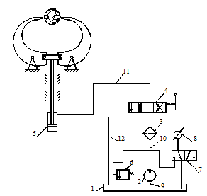 Рис. 1. Схема гидравлическая принципиальная механизма зажима бревна гидравлической тележки ПРТ8 - 2: 1 – гидробак; 2 – насос; 3 – фильтр; 4 – гидрораспределитель; 5 – гидроцилиндр; 6 – клапан предохранительный; 7 – золотник включения манометра; 8 – манометр; 9 – всасывающая линия; 10 – напорная линия; 11 – исполнительная линия; 12 – сливная линия. 2. ПОРЯДОК РАСЧЕТА НЕРЕГУЛИРУЕМОГО ОБЪЕМНОГО ГИДРОПРИВОДА ВОЗВРАТНО-ПОСТУПАТЕЛЬНОГО ДВИЖЕНИЯ 2.1. Выбор рабочего давления в гидросистеме Таблица 1 Рекомендуемые рабочие давления в зависимости от усилия на штоке гидроцилиндра