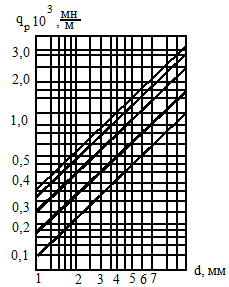где в – диаметр уплотняемой поверхности, м; qр – сила трения на 1 м длины уплотнения, МН/м. Значения qр в зависимости от диаметра сечения резинового кольца в и давления рабочей жидкости при предварительном (монтажном) сжатии определяется по номограмме (рис. 2). Выбор резиновых манжет для уплотнений гидроцилиндров производят по ГОСТ 6969-54, а резиновых колец – по ГОСТ 9833-61.