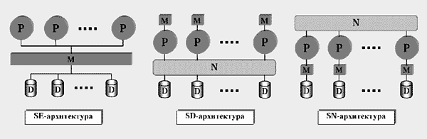 Рис.3. Три классические архитектуры: SE-архитектура с разделяемой памятью и дисками, SD-архитектура с разделяемыми дисками, SN-архитектура без совместного использования ресурсов. В SE-системах все процессоры P с помощью общей шины подключаются к разделяемой памяти M и дискам D. Процессоры передают друг другу данные через общую память. В SD-системах каждый процессор имеет свою собственную память, однако диски по-прежнему разделяются всеми процессорами. Для связи процессоров друг с другом используется высокоскоростная соединительная сеть N. В SN-системах каждый процессор имеет собственную память и собственный диск. Обмен данными между процессорами, как и в предыдущем случае, происходит через высокоскоростную соединительную сеть. В системах с разделяемой памятью и дисками все процессоры при помощи общей шины соединяются с разделяемой памятью и дисками. Обозначим такую архитектуру как SE (Shared-Everything). В SE-системах межпроцессорные коммуникации могут быть реализованы очень эффективно через разделяемую память. Поскольку здесь каждому процессору доступны вся память и любой диск, проблема балансировки загрузки процессоров не вызывает принципиальных трудностей (простаивающий процессор можно легко переключить с одного диска на другой). В силу этого SE-системы демонстрируют для небольших конфигураций (не превышающих 20 процессоров) более высокую производительность по сравнению с остальными архитектурами. Однако SE-архитектура имеет ряд недостатков, самые неприятные из которых - ограниченная масштабируемость и низкая аппаратная отказоустойчивость. При большом количестве процессоров здесь начинаются конфликты доступа к разделяемой памяти, что может привести к серьезной деградации общей производительности системы (поэтому масштабируемость реальных SE-систем ограничивается 20-30 процессорами). Не могут обеспечить такие системы и высокую готовность данных при отказах аппаратуры. Выход из строя практически любой аппаратной компоненты фатален для всей системы. Действительно, отказ модуля памяти, шины доступа к памяти или шины ввода-вывода выводит из строя систему в целом. Что касается дисков, то обеспечение высокой готовности данных требует дублирования одних и тех же данных на разных дисках. Однако поддержание идентичности всех копий может существенным образом снизить общую производительность SE-системы в силу ограниченной пропускной способности шины ввода-вывода. Все это исключает использование SE-архитектуры в чистом виде для систем с высокими требованиями к готовности данных. В системах с разделяемыми дисками каждый процессор имеет свою собственную память. Процессоры соединяются друг с другом и с дисковыми подсистемами высокоскоростной соединительной сетью. При этом любой процессор имеет доступ к любому диску. Обозначим такую архитектуру как SD (Shared-Disk). SD-архитектура по сравнению с SE-архитектурой демонстрирует лучшую масштабируемость и более высокую степень отказоустойчивости. Однако при реализации SD-систем возникает ряд серьезных технических проблем, которые не имеют эффективного решения. По мнению большинства специалистов, сегодня нет весомых причин для поддержки SD-архитектуры в чистом виде. В системах без совместного использования ресурсов каждый процессор имеет собственную память и собственный диск. Процессоры со