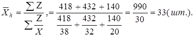 Каждый рабочий первого цеха за смену производит в среднем 30 единиц продукции. По второму цеху известны значения усредняемого признака X и объем произведенной продукции. Последний определяется умножением выработки одного рабочего X на число рабочих f, т.е. количество произведенной продукции является объемом усредняемого признака: Z=X*f. Поэтому для расчета средней по цеху № 2 необходимо применить формулу средней гармонической взвешенной: