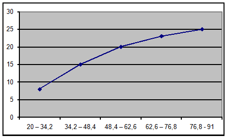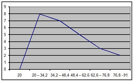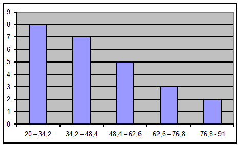 Отже інтервал групування дорівнює: і = (91 – 20)/5 = 14,2