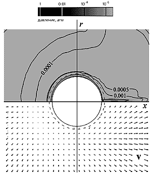 Модель столкновения большого облака мелких частиц с Марсом. На левом рисунке показаны распределения давления, плотности, а также поле скоростей газа около Марса через 600 с после вторжения облака (на высоте 400 км) при скорости n0 =40 км/с. В этом случае облако срывает большую часть атмосферы планеты. На правом рисунке — характеристики атмосферы через 3000 с после вторжения облака вдвое меньшего объема, в 10 раз менее плотного и с начальной скоростью 5.3 км/с. Здесь окончательный результат столкновения противоположный — наращивание на 15% массы атмосферы Марса. Расчеты проводились для осесимметричной картины течения; x — координата вдоль вектора начальной скорости облака, r — расстояние от оси симметрии. Рисунок справа соответствует второму случаю и дает картину течения в момент времени t = 3000 с. Обращаем внимание, что стрелки, изображающие поле скоростей, для обоих рисунков даны в разных масштабах (во втором случае стрелки той же длины соответствуют примерно в шесть раз меньшей скорости, чем в первом). Здесь максимальные скорости в газе (5.3 км/c) лишь немного превосходят вторую космическую скорость, а распределение плотности таково, что уносится незначительная масса газа, поэтому атмосфера не теряет, а наращивает свою массу на 15% за счет паров частиц. Оба рисунка соответствуют примерно одной и той же стадии процесса. Здесь показаны картины течений после воздействия ударной волны на всю поверхность планеты. Итак, в результате взаимодействия с пылевым облаком масса атмосферы может как существенно уменьшиться, так и возрасти. В принципе, можно поставить следующую обратную задачу: найти такие параметры налетающего облака частиц, при которых будет уноситься заданная часть массы исходной атмосферы. Иначе говоря, зная нынешние характеристики марсианской атмосферы и предполагая, что в далеком прошлом у поверхности они были, например, как у Земли, можно определить (хотя, конечно, и неоднозначно) параметры облака, встреча с которым вызвала предполагаемую потерю марсианской атмосферы. А затем и оценить, какие процессы и тела могли породить такого “похитителя” атмосферы. Возникает естественный вопрос: может ли такая катастрофа произойти с Землей? Очевидно, взаимодействие космического облака частиц с атмосферой Земли имеет принципиально такой же характер, как и для Марса. Различие — только в других значениях параметров: размеров планеты, силы тяжести, второй космической скорости. Земля больше Марса и потерять атмосферу в результате подобного катастрофического процесса ей труднее, но такая возможность не исключена. Наши расчеты позволили установить, от столкновения с каким пылевым облаком это может случиться. Правда, подробное исследование взаимодействия с атмосферой облаков частиц, которые могут унести в космос значительную часть атмосферы, для Земли не столь актуально, как для необитаемой планеты. Воздействие ударной волны и потоков излучения на земную поверхность будет заведомо губительно для жизни на Земле и при существенно меньшей энергии налетающего облака, когда об уносе значительной части атмосферы можно еще не говорить. Так, если размер облака сравним с диаметром Земли, то уже при небольших скоростях влета (скажем, со второй космической скоростью 11.2 км/с) ударная волна станет опасной даже для самого разреженного града — при 