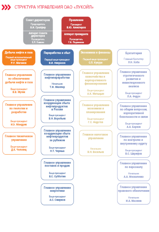 Целью выполнения курсовой работы является изучение проявлений аспектов теории управления в организации. Для изучения я взяла компанию ОАО НК «Лукойл». Общая информация о Компании ОАО "ЛУКОЙЛ" - одна из крупнейших международных нефтегазовых компаний - была основана в 1991 году, когда был создан государственный нефтяной концерн "ЛангепасУрайКогалымнефть" ("ЛУКойл"). В 1993 году на базе государственного концерна было создано акционерное общество открытого типа "Нефтяная компания "ЛУКОЙЛ". В 1995 году "ЛУКОЙЛу" переданы контрольные пакеты акций девяти нефтедобывающих, сбытовых и сервисных предприятий в Западной Сибири, на Урале и в Поволжье. В 1997 году для управления нефтехимическими предприятиями ЛУКОЙЛа создана компания "ЛУКОЙЛ-Нефтехим". В 1999 году ЛУКОЙЛ приобрел несколько компаний и предприятий, в том числе НПЗ в Бургасе и Одессе, а также ОАО "КомиТЭК". В 2000 году компания вышла на рынок нефтепродуктов, купив Getty Petroleum Marketing и принадлежащую компании сеть автозаправочных станций. В 2004 году американская нефтяная компания ConocoPhillips выкупила госпакет в НК «Лукойл» (7,59%) почти за 2 млрд. долларов. В конце 2006 года ЛУКОЙЛ купил у ConocoPhillips более 370 автозаправочных станций в Европе. НК «Лукойл» - одна из крупнейших международных вертикально интегрированных нефтегазовых компаний. Основными видами деятельности являются: · разведка и добыча нефти и газа. Основная деятельность НК «Лукойл» в секторе разведки и добычи осуществляется на территории России, основной ресурсной базой является Западная Сибирь. · производство нефтепродуктов и нефтехимической продукции. НК «Лукойл» владеет современными нефтеперерабатывающими, газоперерабатывающими и нефтехимическими заводами, расположенными в России, Восточной Европе и странах ближнего зарубежья. · сбыт произведенной продукции. Основная часть продукции реализуется на международном рынке. НК «Лукойл» занимается сбытом нефтепродуктов в России, Восточной и Западной Европе, странах ближнего зарубежья и США. НК «Лукойл» является второй крупнейшей частной нефтегазовой компанией в мире по размеру доказанных запасов углеводородов. Доля Компании в общемировых запасах нефти составляет около 1,3%, в общемировой добыче нефти - около 2,3%. Компания играет ключевую роль в энергетическом секторе России, на ее долю приходится почти 19% общероссийской добычи и переработки нефти. По состоянию на начало 2008 года доказанные запасы нефти Компании составляли 15 715 млн. барр., газа – 27 921 млрд фут3 , что в совокупности составляет 20 369 млн. барр. н.э. В секторе разведки и добычи НК «Лукойл» располагает качественным иверсифицированным портфелем активов. Основным регионом нефтедобычи Компании является Западная Сибирь. НК «Лукойл» также реализует проекты по разведке и добыче нефти и газа за пределами России: в Казахстане, Египте, Азербайджане, Узбекистане, Саудовской Аравии, Колумбии, Венесуэле, Кот-д’Ивуаре, Гане, Ираке. В 2005 году с введением в эксплуатацию Находкинского месторождения Компания начала реализацию газовой программы, в соответствии с которой добыча газа будет расти ускоренными темпами. Ресурсной базой для реализации этой программы являются месторождения Большехетской впадины, Каспийского моря и Центрально-Астраханское месторождение в России, а также международные газовые проекты: Кандым – Хаузак – Шады в Узбеки