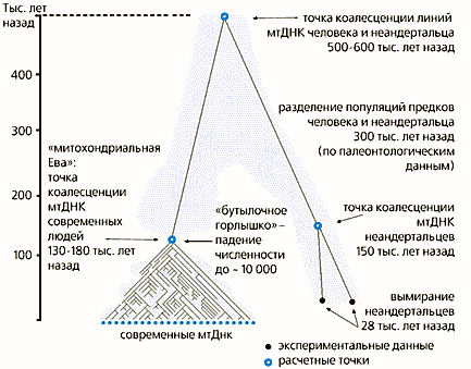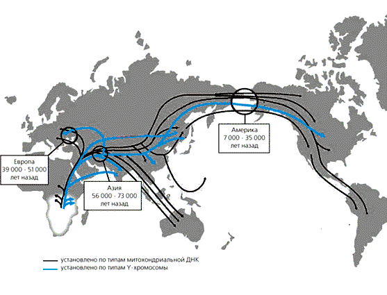 Результаты молекулярно-генетических исследований свидетельствуют в пользу третьей гипотезы. Обе неандертальские мтДНК имеют общие отличия от мтДНК людей, выходящие за границы внутривидового разнообразия H.sapiens. Это говорит о том, что неандертальцы — генетически отдельная, хотя и близкородственная человеку ветвь. По числу различий между их мтДНК время существования последнего общего предка человека и неандертальца оценивается в 500 тыс. лет. Палеонтологи считают, что предки неандертальцев появились в Европе около 300 тыс. лет назад, т.е. генетические линии, ведущие к человеку и неандертальцу, разделились раньше этой даты, как показывают датировки по мтДНК. Таким образом, неандерталец эволюционировал в Европе одновременно с предком современного человека в Африке. Известно, что в Европе 40—50 тыс. лет назад расселился человек современного типа, а неандертальцы вымерли 28 тыс. лет назад. Неизвестно, какова связь этих событий — проиграл ли неандерталец в конкуренции с человеком или вымер по другим причинам. Волны миграций и заселение континентов Считается, что циклические изменения климата, происходившие с интервалом в десятки тысяч лет, играли существенную роль в эволюции и распространении всех видов, в том числе и человека. В периоды похолодания нарастала масса континентальных ледников, обитаемые природно-климатические зоны сдвигались на юг, уровень моря и озер снижался на сотни метров, увеличивалась площадь пустынь, съеживались тропические леса. С наступлением ледника в Европе сокращались обитаемые зоны и численность животных, сплошное “море” жизни распадалось на отдельные “озера”. В периоды потепления повышались численность и разнообразие живых форм, виды расселялись на пригодные для жизни территории — из Африки в Азию и Европу через Суэцкий перешеек и в Европе — на освободившиеся из-под ледника территории. Таким образом, контакты африканской и евразийской биоты определялись глобальными циклами потепления—похолодания. Эти колебания приводили к значительным изменениям флоры и фауны всего Земного шара.