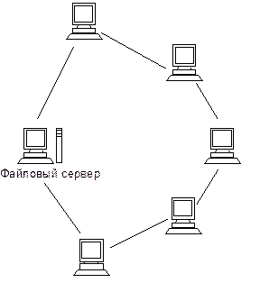 рис.1 Топология типа звезда Пропускная способность сети определяется вычислительной мощностью узла и гарантируется для каждой рабочей станции. Коллизий (столкновений) данных не возникает. Кабельное соединение довольно простое, так как каждая рабочая станция связана с узлом. Затраты на прокладку кабелей высокие, особенно когда центральный узел географически расположен не в центре топологии. При расширении вычислительных сетей не могут быть использованы ранее выполненные кабельные связи: к новому рабочему месту необходимо прокладывать отдельный кабель из центра сети. Топология в виде звезды является наиболее быстродействующей из всех топологий вычислительных сетей, поскольку передача данных между рабочими станциями проходит через центральный узел (при его хорошей производительности) по отдельным линиям, используемым только этими рабочими станциями. Частота запросов передачи информации от одной станции к другой невысокая по сравнению с достигаемой в других топологиях. Производительность вычислительной сети в первую очередь зависит от мощности центрального файлового сервера. Он может быть узким местом вычислительной сети. В случае выхода из строя центрального узла нарушается работа всей сети. Центральный узел управления - файловый сервер мотает реализовать оптимальный механизм защиты против несанкционированного доступа к информации. Вся вычислительная сеть может управляться из ее центра. Кольцевая топология. При кольцевой топологии сети рабочие станции связаны одна с другой по кругу, т.е. рабочая станция 1 с рабочей станцией 2, рабочая станция 3