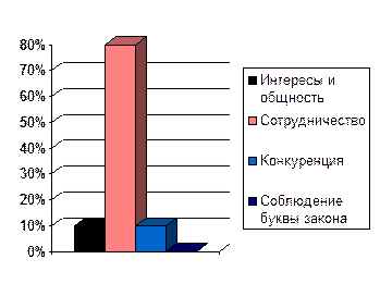 Рис. 4. Отношение с другими организациями. Это говорит о том, что управление и комитет в целом строит свою работу в первую очередь на сотрудничестве, а не на конкуренции и соглашениях. Что способствует более качественному выполнению целей и формированию в коллективе благоприятного климата. Так же в ходе проведения исследования нами было установлено, что власть в комитете в основном основана на: - компетентности, опыте и знаниях, так ответили 45% сотрудников; - способности поддерживать дисциплину и порядок, ответили 20% сотрудников; - должностной позиции 0% из всего числа респондентов; - способности и желании помогать другим людям, ответили 35% сотрудников.