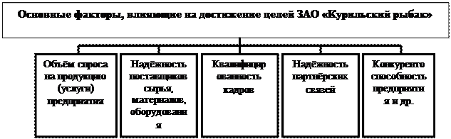 Рисунок 1 - Основные цели приоритетного развития ЗАО «Курильский рыбак» Любая из вышеназванных целей производственной деятельности может вполне выступать как самостоятельная важнейшая цель рыбного производства. Цели развития предприятия ЗАО «Курильский рыбак» направлены на достижение новых, более совершенствованных технологий и создание дополнительных производственных ресурсов. Устанавливаемые предприятием цели зависят от влияния разнообразных факторов. На рисунке 2 показаны факторы влияющие на достижения целей развития предприятия.