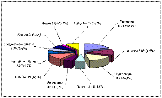 Географическая структура торговли России со странами – основными партнерами из стран дальнего зарубежья в 2007 г. (2006 г.) (удельный вес товарооборота в %)