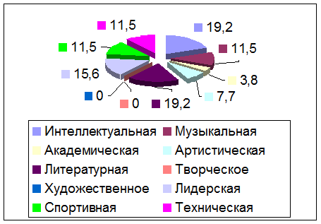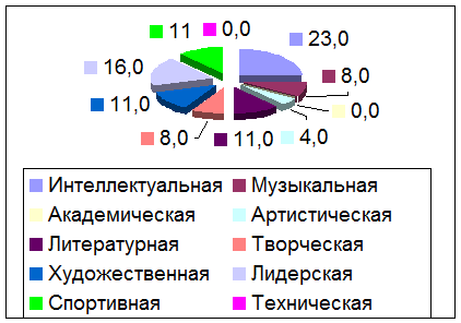 2.3 Выводы и рекомендации Исходя из полученных результатов можно сделать следующие выводы: -у всех исследованных детей имеются ярко выраженные способности в разных областях деятельности; -наиболее выраженными являются способности в интеллектуальной области, спортивной, литературной; -мы исследовали родительские наблюдения за способностями детей. Для того, чтобы наиболее достоверно выявить одаренность ребенка, нужно применять и другие методики исследования одаренности. Рекомендации: -Среди форм и методов внеурочной работы широкими возможностями выявления и развития одаренных учащихся обладают различные факультативы, кружки, конкурсы, интеллектуальный марафон, привлечение школьников к участию в самых различных олимпиадах и конкурсах вне школы и, разумеется, система внеурочной исследовательской работы учащихся; -Основной формой организации учебного процесса в школе остается урок. Формы и приемы в рамках отдельного урока должны отличаться значительным разнообразием и направленностью на дифференциацию и индивидуализацию работы. Широкое распространение должны получить групповые формы работы, различного рода творческие задания, различные формы вовлечения учащихся в самостоятельную познавательную деятельность, дискуссии, диалоги. -Создание подсистемы диагностики одаренности учащихся школы и организация эффективного функционирования этой системы. -Расширение и совершенствование деятельности психологической службе в школе. -Реализация системы работы с одаренными учащимися является одним из приоритетных направлений в работе школы. Психолог разрабатывает программы работы с одаренными детьми. Заключение В заключение хотелось бы сказать следующее. По отношению к детям с различными проявлениями одаренности часто демонстрируется или восхищение или, наоборот, скептическое, настороженное поведение. Бывают также случаи, когда родители и окружающие ребенка взрослые высказывают опасения, не является ли раннее проявление одаренности результатом его болезненного состояния. Имеющиеся в психологии данные говорят о том, что одаренные дети в большинстве своем не отличаются болезненностью или склонностью к нервным срывам и в физическом развитии не отстают от своих сверстников. Следует помнить, что по отношению к любым детям, а тем более к одаренным, являются неуместными как неумеренные восторги, так и проявления весьма критического, недоверчивого отношения. Одаренного ребенка никогда не следует выставлять напоказ, возвеличивать, делать его предметом радости и гордости родителей и школы. Не следует и приходить в отчаяние, что он не похож на других, принуждать его «быть как все». Единственное, что следует поощрять в ребенке,— это его желание работать ради работы, а не его стремление обогнать школьных товарищей. Наиболее правильная форма воспитания одаренных детей — обращаться с ними как с таковыми и в то же время усиливать в них стремление к дальнейшему развитию, самоопределению, закреплению индивидуальных склонностей и проявлений. Необходимо, чтобы воспитание оживляло и поддерживало чувство самостоятельности, смелость в отступлении от общепринятого шаблона, поиск нового способа решения. Итак, следует понимать, что одаренный ребенок нуждается в особом подходе со стороны родителей, педагогов и сверстников. С э