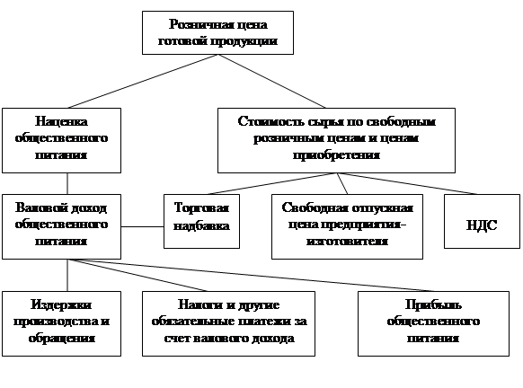 Рисунок 1. Формирование издержек общественного питания. На этом рисунке отражены присущие отрасли стадии процесса воспроизводства (производство, обмен и потребление) и обособление издержек производства от затрат на сырьё, продукты и полуфабрикаты. В состав издержек производства включаются только затраты, связанные с производством собственной продукции (затраты на транспортировку и хранения сырья и полуфабрикатов; заработная плата работников производства; расходы на топливо и электроэнергию для производственных нужд; амортизация основных производственных фондов и др.). Издержки обращения представляют собой затраты на реализацию продукции собственного производства и покупных товаров (оплата труда буфетчиков, продавцов, барменов; расходы на транспортировку покупных товаров; амортизация стоимости торгового оборудования, магазинов, киосков и т.д.) и затраты на организацию потребления (заработная плата официантов, гардеробщиков, уборщиков обеденных залов; расходы по содержанию помещений и оборудования обеденных залов, износу столовой посуды и т.д.). Однако в практике учёта и планирования весьма трудно разграничить эти издержки, поскольку многие работники отрасли выполняют одновременно различные функции. Поэтому на предприятиях общественного питания определяются совокупные издержки, связанные с производством, реализацией продукции и покупных товаров и обслуживанием потребителей. В силу этого показатель себестоимости продукции не учитывается, не планируется, не калькулируется. Это обстоятельство обуславливает отличия в формировании цен на продукцию собственного производства в ресторанах от промышленности. Калькулирование продажной цены продукции, выпускаемой предприятиями общественного питания, осуществляется только на основании стоимости сырья, включаемого в рецептуру блюд. 2.2.2. Структура продажной цены на готовую продукциюОсобенностью ценообразования в ресторанах является также применение разных цен на продукты, поступающие на предприятия из различных источников. Продукты могут быть закуплены непосредственно у предприятий изготовителей (по свободным отпускным ценам), в розничной торговой сети, на колхозных рынках и у населения. В этой связи на предприятиях общественного питания, обслуживающих население, сырьё включается в калькуляцию по розничным ценам, которые образуются из отпускных цен предприятий-изготовителей, дифференцированных торговых надбавок в установленных размерах и налога на добавленную стоимость по установленной ставке. Сырьё и продукты, закупаемые на рынках, у населения, в розничной торговой сети включаются в расчётную калькуляцию по ценам приобретения без торговых надбавок с применением наценок на продукцию собственного производства предприятий общественного питания. Отдельные виды сырья, используемого при приготовлении блюд, поступают на предприятия общественного питания в промышленной упаковке, оплата за которые производилась по розничной цене за банку, бутылку, т.е. за массу брутто или за 1 л продукта. Поскольку при определении продажной цены блюда сырьё в калькуляцию включается в килограммах и соответственно указывается цена за 1 кг продукта, возникает необходимость определить стоимость за 1 кг поступивших продуктов. Так, например, по накладной № 027221 от базы «Бака