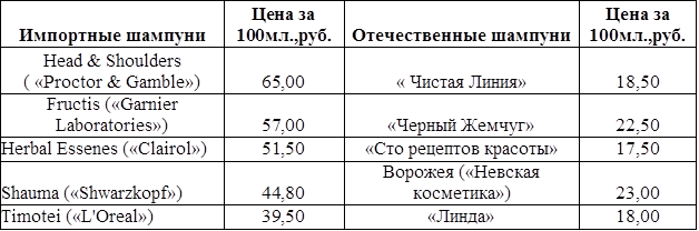 3. В то же время обследования показали, что среди опрошенных потребителей жирный тип волос имеют около 30% . Эти данные свидетельствуют о несоответствии структуры ассортимента по назначению фактическим потребностям. Одним из наиболее важных факторов, определяющих спрос на российском рынке, является цена товара. Анализ соотношения цен отечественных и импортных шампуней по наиболее распространенным маркам показал, что цена отечественных шампуней значительно ниже, чем импортных (табл. 1). Однако отечественная продукция, произведенная по новым технологиям из высококачественного сырья, приблизилась по цене к импортной. Очевидно, что увеличение конкуренции между импортными и отечественными товарами приведет к повышению уровня качества отечественной продукции, и в дальнейшем эта тенденция будет усиливаться. Таблица 1. Средняя розничная цена шампуней на рынке Владимирской области Таблица 2 Средняя розничная цена кремов на рынке Владимирской области (начало 2009 г.)