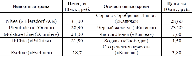 Из кремов наиболее популярным во Владимирской области является известный крем Nivea немецкой фирмы Beirsdorf. В пятерку самых популярных импортных кремов вошли кремы фирм Avon, Oriflame, реализующих свою продукцию методом прямых продаж. Среди наиболее востребованных отечественных кремов отмечена продукция известных российских фирм «Калина» (1-е, 2-е места), «Невская косметика», «Свобода» (табл. 5). Таблица 5 Рейтинг популярности кремов на рынке Владимирской области
