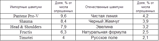Рис. 6. Структура потребительских предпочтений косметических средств Опрос показал, что больше 60% потребителей предпочитают использовать от одной до трех марок косметических средств (рис. 6, Б). Так, самыми популярными шампунями среди потребителей, пользующихся только одной маркой, являются Head & Shoulders, Pantene Pro-V, Shauma, Fructis (соответственно 42, 30, 18, 10%). Остальные потребители (38%) не имеют приверженности, и пользуются различными марками шампуней и кремов. Следует отметить, что именно эта целевая группа «неориентированных» потребителей наиболее интересна для производителей, так как они методом проб приобретают новинки, впервые выводимые на рынок. Под влиянием этой группы совершенствуется и обновляется ассортимент косметических средств. На рынке медиа-маркет, который нами изучался, большое значение имеет марка товара. Было проведено определение рейтинга популярности шампуней (табл. 4). Самыми популярными марками являются импортные шампуни, лидеры среди них — Pantene Pro-V, Shauma, Head & Shoulders, Fructis, Timotei. Эти марки часто и активно рекламируются, но основная причина спроса на них определяется их высоким качеством. Положительным фактором при покупке отечественной продукции является ее низкая цена, что устраивает потребителей. Таблица 4 Рейтинг популярности шампуней на рынке Владимирской области