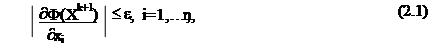 Формула (2.17) представляет собой первые три члена разложения функции Ф(Х) в ряд Тейлора в окрестности точки Х0 , поэтому при аппроксимации функции Ф(Х) функцией j(Х) возникает ошибка не более чем (½Х-Х0 ½)3 . С учетом (2.17) в методе Ньютона исходными данными являются требуемая точность e и начальная точка поиска Х0 , а получение новых точек производится по формуле: