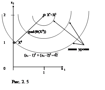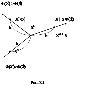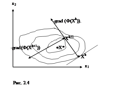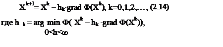 то есть выбор шага производится по результатам одномерной оптимизации по параметру h. Основная идея метода наискорейшего спуска заключается в том, что на каждой итерации метода выбирается максимально возможная величина шага в направлении наискорейшего убывания целевой функции, то есть в направлении вектора-антиградиента функции Ф(Х) в точке Хk ( рис. 2. 4).