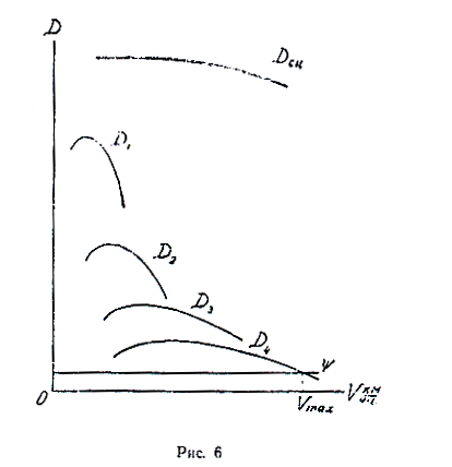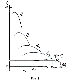 На графиках тягового баланса (рис.4) и баланса мощности (рис.5) точка пересечения кривой усилия или мощности на ободе колеса с кривой суммарной силы сопротивления или с кривой суммарных потерь мощности характеризует максимальное значение скорости при данном коэффициенте сопротивления дороги. 3. График динамического фактора строят на основании уравнеиния динамического фактора