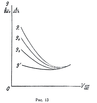 График 2 (рис. 12) дает величину коэффициента Kn, выражающего зависимость удельного расхода от оборотов двигателя. Здесь за 100% n принимаются обороты при максимальной мощности nN. Зная удельный расход gN при максимальной мощности, который задается, как исходная величина, и имея коэффициенты KN и Kn, можно определить значение g для любых условий движения, т.е. при любой скорости движения по любой дороге. Для того, чтобы получить величину коэффициента KN, необходимо определить процент использования мощности двигателя при движении с различной скоростью по дорогам разного качества, т.е. с различным коэффициентом ψ. Выбираем три типа дорог с коэффициентами ψ1= 0,02, ψ2=0,025 и ψ3= 0,04. При построении экономической характеристики грузовых автомобилей большой грузоподъемностью (свыше 10-12 тонн) следует принять ψ3= 0,03. Для каждой дороги вычисляют мощность, затрачиваемую при движении с разной скоростью, приведенную к валу двигателя. Из баланса мощности при установившемся движении известно, что