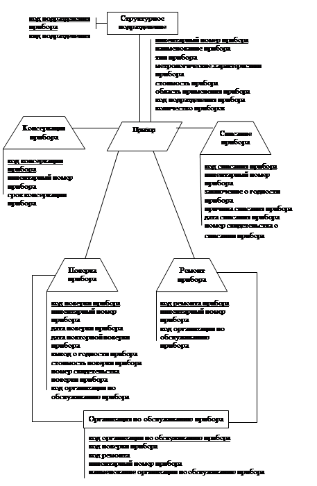 Рисунок 1 Инфологическая модель предметной области 3. Создание базы данных в Microsoft Access 2000 В Microsoft Access на правой панели выбираем пункт "Новая база данных" и далее в открывшемся окне "Файл новой базы данных" указываем имя базы данных "Метрологическое обеспечение университета" и папку, в которой она будет храниться, и нажимаем кнопку "Создать". При этом откроется окно базы данных "Метрологическое обеспечение университета", которое можно разделить на три зоны: панель инструментов; панель типов объектов базы данных; панель ранее созданных объектов выбранного типа (для новой базы данных эта панель должна быть пустой). 3.1 Создание Таблиц базы данных Нами созданной базе данных "Метрологическое обеспечение университета" будем реализовывать каждую сущность в виде отдельной таблице, которые приведены в инфологической модели, с аналогичным именем и наименованиями полей. Создание таблиц рассмотрим на конкретном примере. 1) Создадим таблицу "Прибор", состоящую из восьми полей. Для этого в окне базы данных "Метрологическое обеспечение университета" на панели созданных объектов, двойным нажатием левой клавиши мыши выполним действие "Создание таблицы в режиме конструктора", при этом откроется окно конструктора таблицы (рисунок 2). В окне последовательно вводим наименования полей и присваиваем соответствующие им типы: "Инвентарный номер прибора" - "Числовой" (первичный ключ); "Наименование прибора", "Тип прибора", "Метрологические характеристики", "Область применения прибора" - "Текстовый", "Стоимость прибора", "Код подразделения", "Количество приборов" - "Числовой". Необходимость реализации в дальнейшем связей между таблицами, требует задать ключевое поле, в нашей таблице - это поле "Инвентарный номер прибора". Для этого установим в этом поле указатель мыши, нажмем правую клавиши и в сплывающем меню выберем пункт "Ключевое поле" - напротив этого поля появится соответствующий значок Закрываем окно конструктора и сохраняем данную таблицу, присвоив ей имя "Прибор".