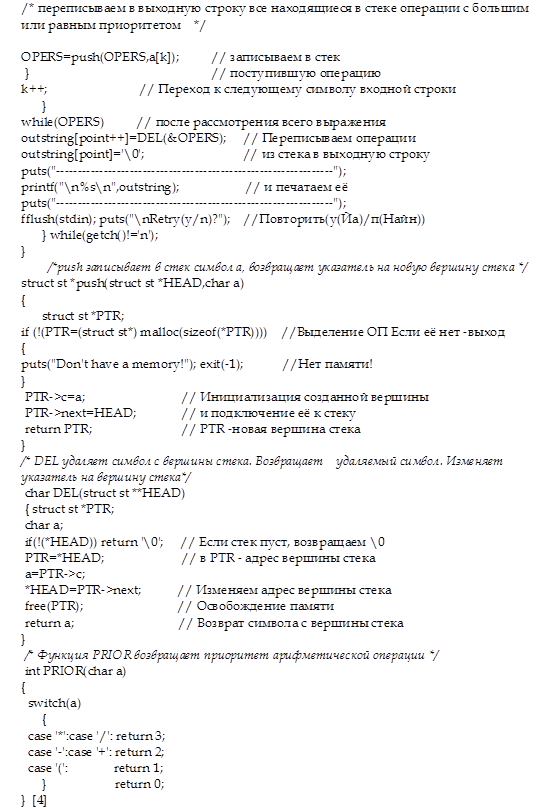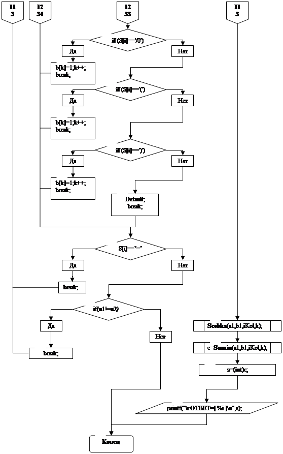 1. Анализ существующих методов решения задачи 2. Детальное описание используемых методов 3.3 Детальное описание основной функции 3.4 Детальное описание функции ChartoInt 3.5 Детальное описание функции Scobka 3.6 Детальное описание функции Sumin 3.7 Общая структура программного средства 4.2 Блок схема функции ChartoInt 5. Заключение 8. Приложение 1 9. Приложение 2 Язык "C" является универсальным языком программирования. Язык "C" - это язык относительно "низкого уровня". Это означает, что "C" имеет дело с объектами того же вида, что и большинство ЭВМ, а именно, с символами, числами и адресами. Они могут объединяться и пересылаться посредством обычных арифметических и логических операций, осуществляемых реальными ЭВМ. В языке "C" отсутствуют операции, имеющие дело непосредственно с составными объектами, такими как строки символов, множества, списки или с массивами, рассматриваемыми как целое. Язык не предоставляет никаких других возможностей распределения памяти, кроме статического определения и механизма стеков, обеспечиваемого локальными переменных функций; здесь нет ни "куч"(heap), ни "сборки мусора". Наконец, сам по себе "C" не обеспечивает никаких возможностей ввода-вывода: здесь нет операторов read или write и никаких встроенных методов доступа к файлам. Все эти механизмы высокого уровня должны обеспечиваться явно вызываемыми функциями. Аналогично, язык "C" предлагает только простые, последовательные конструкции потоков управления: проверки, циклы, группирование и подпрограммы, но не мультипрограммирование, параллельные операции, синхронизацию или сопрограммы. Язык "C" не является языком со строгими типами в смысле паскаля. Наконец, язык "C", подобно любому другому языку, имеет свои недостатки. Некоторые операции имеют неудачное старшинство; некоторые разделы синтаксиса могли бы быть лучше; существует несколько версий языка, отличающихся небольшими деталями. Тем не менее, язык "C" зарекомендовал себя как исключительно эффективный и выразительный язык для широкого разнообразия применений программирования. [1] Одной из главных причин, лежащих в основе появления языков программирования "высокого уровня", явились вычислительные задачи, требующие больших объёмов рутинных вычислений. Поэтому к языкам программирования предъявлялись требования максимального приближения формы записи вычислений к естественному языку математики. В этой связи одной из первых областей системного программирования сформировалось исследование способов трансляции выражений. Наибольшее распространение получил метод трансляции с помощью обратной пользовательской записи. [4] Методы решения задачи использования обратной пользовательской записи детально рассмотрены в данной курсовой работе. 1. Анализ существующих методов решения задачи Существует множество решений данной задачи. На данный момент нам известно 3 метода решения задачи. 1 – с использованием стека, 2 - это, так называемое двойное использование стека, 3 - метод использование массивов. Для сравнения приведу один из примеров использования стека для решения данной задачи:
