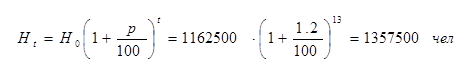 Годовой прирост населения примем равным 1.2%. Определим количество населения в перспективном году в Курской области: Численность постоянного населения Курской области на 2002 год составила 1162.5 тысячи человек.