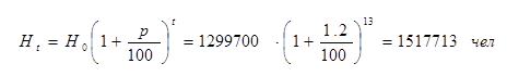 где: Н0 — народонаселение в период переписи населения, чел.; р - средний годовой прирост населения в данной местности, % (принимается по данным переписи 1-1.2%); t — период, определяемый как разность между назначенным перспективного проектирования и годом проведения переписи населения. Год перспективного проектирования принимается на 5-10 лет вперед по сравнению с текущим временем. В курсовом проекте следует принять 5 лет вперед. Следовательно, t=5+(tm -t0 ), где Определяем