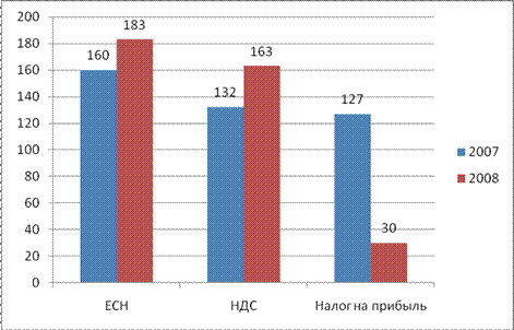 Рисунок 2 - Налоги, уплаченные ООО «Медчеста» за 2007–2008 гг. По данным таблицы 2 и рисунка 2 можно сделать вывод, что общая сумма налогов уменьшилась в 2008 г. по сравнению с 2007 г. на 18%. При этом это произошло за счет снижения налога на прибыль на 126%, т.е. можно сказать, что за 2008 год ухудшились финансовые показатели организации. В то же время остальные виды уплачиваемых налогов возросли, в т.ч НДС на 23%, ЕСН – на 14%. С этой точки зрения для оценки налогового бремени лучше использовать показатель интегральной полной ставки налогообложения (ПСН) добавленной стоимости как отношения суммы всех налогов и обязательных платежей, внесенных предприятием, его работниками и собственниками в госбюджет и государственные внебюджетные фонды, к величине добавленной стоимости при условии уплаты общих для всех предприятий налогов и реализации продукции на внутреннем рынке. Упрощенная формула расчета такова: Рассчитаем налоговое бремя для ООО «Медчеста» по формуле: ПСН = (НП + НР + НС)* 100%/ДС, где ДС – добавленная стоимость; НП – общая сумма налогов с предприятия, включая сборы, обязательные отчисления и другие изъятия в бюджет у внебюджетные фонды; НР – налоги с работников (прежде всего, подоходный налог и взносы в пенсионный фонд); НС – налоги с собственников или инвесторов (налог на прибыль от долевого участия или дивиденды). Зарубежные исследования показывают, что если полная ставка налогообложения превышает 40% (так называемый порог Леффера), то инвестирование в производство становится невыгодным. ПСН в 2008 г. = (347+78234) * 100%/3706=21% Из приведенных расчетов следует, что порог Леффера не превышает 40%, это значит, что инвестирование в производство может быть выгодным, при снижении налоговой нагрузки. Подведя итог, еще раз отметим в ООО «Медчеста» при анализе финансовых показателей наблюдается кризисное финансовое состояние. Предприятие полностью зависит от заемных источников финансирования. Собственного капитала, краткосрочных и долгосрочных кредитов и займов не хватает для финансирования материальных оборотных средств, т.е. пополнение запасов идет за счет средств, образующихся в результате замедления погашения кредиторской задолженности. Это могло стать следствием того, что предприятие имеет непосильную налоговую нагрузку. При чистой прибыли 94417 рублей, налоги к уплате составили 131650 рублей (в т.ч. НДС 61424 руб. + ЕСН 46622 руб. + Налог на прибыль 23604 руб.). С целью минимизации налоговой нагрузки, руководству предприятия можно порекомендовать перейти на упрощенную систему налогообложения (УСН).