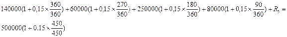 Определите величину силы роста при начислении непрерывных процентов в течение двух лет, которая эквивалентна: а) простой процентной ставке 26 % годовых; б) сложной процентной ставке 26 % годовых с ежемесячным начислением процентов. Решение: a) Проверка б) Проверка Долг в сумме 500 тыс. руб. требуется погасить в течение 1 года 5 месяцев с 16 января 2008 г. по 16 апреля 2009 г. Кредитор согласен получать частичные платежи, предусматривается начисление простых процентов по ставке 15 % годовых. Частичные платежи были следующими: 16 апреля 2008г. 140 тыс. руб. 16 июля 2008г. 60 тыс. руб. 16 октября 2008г. 250 тыс. руб. 16 января 2008г. 80 тыс. руб. 1. Рассчитать контур финансовой операции для актуарного метода и метода торговца и определить размер суммы последнего погасительного платежа. Решение: Вычислим размер погасительного платежа актуарным методом. 16 января 2008 г. долг кредитору составил 500 тыс. р. 16 апреля 2008 г. долг с процентами составил: