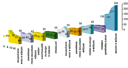 Рис. 1. Интенсивность сцинтилляций в минуту образцов биологических тканей после введения раствора с радиоактивной меткой (фоновое значение 40-50 сцинтилляций в минуту). Вторая группа включала в себя 4 животных. На основании результатов исследования содержания I131 в СТ кроликов из первой группы здесь была предпринята попытка определения количественного распределения радиоактивной метки в течение первых суток в различных структурах глаза. Для этого после подконъюнктивального введения раствора радиоактивного йода производился забой животных через 4, 8,16 и 24 часа. Из каждого энуклеированного глаза, замороженного путем погружения в жидкий азот, при помощи трепана диаметром 7 мм с глубиной установки плунжера 1 мм было получено 8 навесок: 1. склера в проекции цилиарного тела в области коагулятов (на 12 часах). 2. склера в проекции цилиарного тела в районе, противоположном нанесению коагулятов (на 6 часах). 3. Стекловидное тело в проекции цилиарного тела в области коагулятов (на 12 часах). 4. Стекловидное тело в проекции цилиарного тела в районе, противоположном нанесению коагулятов (на 6 часах). 5. Роговица. 6. Влага передней камеры 7. Склера в области зрительного нерва. 8. Стекловидное тело в области зрительного нерва Кроме того, отдельно была измерена радиоактивность всего оставшегося витреального вещества, как предполагаемого депо вводимой субстанции. В результате произведенных измерений нами были получены следующие данные. Из рис.2 видно, что после введения I131 в область плоской части цилиарного тела в зоне коагулятов через 8 часов отмечается повышение радиоактивности стекловидного тела в прилежащей области, которое достигает максимума через 12 часов, а затем начинает снижаться вследствие перемещения метки вместе с витреальным током.