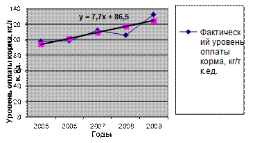 Данные таблицы 2.1 свидетельствуют о том, что уровень оплаты кормов в 2006 и 2007 гг. по сравнению с 2005 годом увеличились на 1 и 13 кг/т к.ед. соответственно, в 2008 году по сравнению с 2005 годом – уровень оплаты корма пошел на спад (-6 кг/т к.ед.). Темп роста в среднем составил 106,9 %, а абсолютное значение в среднем составило 1 кг/т. к.ед. Выявление общей тенденции развития признака может быть проведено с использованием приемов аналитического выравнивания динамического ряда. Аналитическое выравнивание ряда динамики обычно осуществляется следующими способами: по прямой линии; по гиперболе; по параболе второго порядка. Способы аналитического выравнивания хотя и содержат в себе ряд условностей, но более совершенны по сравнению с укрупнением периодов и скользящей средней. Аналитическое выравнивание облегчает выявление общей тенденции и изучение сезонных колебаний в характере динамического ряда. Выбор того или иного способа аналитического выравнивания обусловлен характером (типом) динамики. Характер динамики может быть выражен в виде аналитических уровней, которым на координатном графике соответствует определенная линия — прямая, парабола, гипербола и т. п. Тип динамики целесообразно учитывать при выборе способов аналитического выравнивания динамических рядов. Если динамический ряд имеет более или менее стабильные абсолютные приросты, то выравниваемый динамический ряд может быть выражен в виде прямой линии. При этом на координатном графике фактические уровни ряда наиболее целесообразно показать прямолинейно. При выравнивании по прямой линии закономерно изменяющийся уровень признака рассчитывается как функция времени: