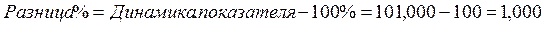 - Для определения разницы в процентах для показателя сопоставляют выявленную динамику показателя с аналогичным результатом предыдущего показателя. Разница (в %) показывает влияние изменения среднегодового числа дней, отработанных одним рабочим, на прирост выручки от продаж. Разница в процентах численности рабочих отчетного года по сравнению с предыдущим, рассчитывается по формуле: