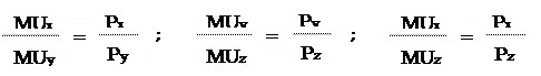 где MUx, MUy , MUz - предельные полезности товаров х, у, z; Px, Py, Pz - цены товаров х, у, z; λ - предельная полезность денег. При этом предполагается, что доход и цены фиксированы. Отношение предельной полезности блага к его цене называется взвешенной предельной полезностью. Из вышеприведенной формулы вытекает, что