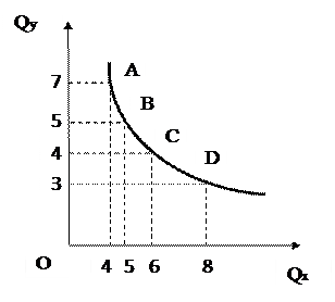 Альтернативные наборы товаров На представленной кривой безразличия мы выделили четыре равнополезные комбинации двух благ в точках А, В, С, D. Эти комбинации дают потребителю одинаковое общее удовлетворение, т.е. А ~ В ~ С ~ D.