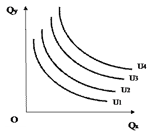 (1.6) то есть соотношение между предельными полезностями благ равно соотношению их цен. 2.4 Порядковый подход к определению полезностиНесмотря на надежды ранних разработчиков теории потребительского выбора, полезность не может быть ни обнаружена, ни количественно измерена. Поэтому в качестве альтернативы количественной теории полезности появляется порядковая теория (от нем. die Ordnung — порядок), разработанная Ф.Эджуортом, В.Парето и И.Фишером. В 30-х гг. XX века после работ Р.Аллена и Дж.Хикса эта теория приобрела завершенную форму и поныне остается наиболее распространенной. Суть порядковой измеримости субъективной полезности заключается в том, что здесь используется не абсолютная (количественный подход), а относительная шкала, показывающая предпочтение потребителя или ранг потребляемого набора благ, и не ставится вопрос о том, на сколько один набор предпочтительнее другого. В порядковой теории полезности утверждение "Набор А предпочтительнее набора В" эквивалентно утверждению "Набор А имеет большую для данного потребителя полезность, чем набор В". Поэтому задача максимизации полезности сводится к задаче выбора потребителем наиболее предпочтительного товарного набора из всех доступных для него. Порядковый подход базируется на нескольких аксиомах: 1. Аксиома полной (совершенной) упорядоченности. Потребитель способен упорядочить альтернативные наборы товаров с помощью отношения предпочтений (>) и безразличия (~). Это означает, что для любой пары товарных наборов А и В потребитель может указать, что либо А > В (А предпочтительнее, чем В), либо В > А, либо А ~ В (А и В равноценны). 2. Аксиома транзитивности. Если первый набор товаров сравним со вторым, а второй с третьим, то первый сравним с третьим. Если А > В > С, или А ~ В > С, или А > В ~ С, то А > С. Если А ~ В ~ С, то А ~ С. Эта аксиома гарантирует согласованность предпочтений. В противном случае поведение потребителя противоречиво. В связи с этим говорят, что "предпочтения свернулись в кольцо", то есть изменились вкусы. 3. Аксиома ненасыщения. Если набор А содержит не меньшее количество каждого товара, чем набор В, но какого-то товара больше, то набор А предпочтительнее. Подразумевается, что потребности в товарах и услугах не имеют насыщения, а посему - большее количество товара предпочитается меньшему. 4. Аксиома независимости потребителя. Удовлетворение потребителя зависит только от количества благ им потребляемых и не зависит от потребления других потребителей. Здесь исключаются такие типичные случаи взаимных влияний, как эффект присоединения к большинству (приобретается то, что покупают другие), эффект сноба (доминирует стремление выделиться из толпы), эффект Веблена (престижное или демонстративное потребление, целью которого является создание неизгладимого впечатления). Функция полезности, определяемая на товарном наборе, как отношение между объемами потребляемых благ и уровнем полезности, есть способ представления предпочтений потребителя. Функция полезности может включать сколько угодно переменных, но в экономической литературе используется двухпродуктовая модель U = f(Qx, Qy), где U – уровень полезности; Qx и Qy - количество товаров x и y; Qx и Qy - переменные факторы. К ней прибегают с целью использования графических методов, ограничивающих исследование двумерным пространством. Но это нева