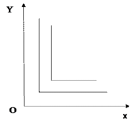 Рисунок 7 – Жесткая взаимодополняемость MRS = 0 На рис. 7 изображена кривая безразличия в случае жесткой взаимодополняемости, когда благ связаны в потреблении жестким соотношением и MRS = 0. На рис. 8 Ошибка! Источник ссылки не найден. Ошибка! Источник ссылки не найден. представлен случай совершенной взаимозаменяемости, когда оба блага воспринимаются потребителем как один, и MRS – постоянная величина.