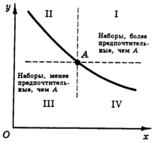 Из рис. 5 видно, что норма замены уменьшается при движении вдоль кривой безразличия, что, впрочем, вполне объяснимо логически: с увеличением количества блага Х и, соответственно, уменьшением количества блага Y потребитель все больше ценит ставшее относительно более дефицитным благо Y и, следовательно, готов отдать все меньшее количество единиц этого блага в обмен на каждую следующую единицу блага X . При приближении точки В к точке А мы получаем предельную норму замены :