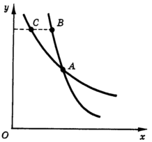 Рисунок 3 – Кривые безразличия имеют отрицательный наклон Предположение III приводит нас к еще одному важному выводу: все точки, лежащие выше данной кривой безразличия, характеризуют наборы благ, имеющие более высокий уровень полезности, чем лежащие на этой кривой безразличия, а точки, лежащие ниже данной кривой безразличия, – наборы, имеющие более низкий уровень полезности. (Предоставим доказательство читателю). Свойство 2 . Две кривые безразличия не могут пересекаться. Предположим, что две кривые безразличия пересекаются в точке А (рис. 4).